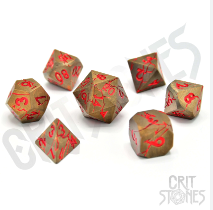 Notre coup de cœur ! Ce set de dés dorés en métal arbore des chiffres rouge vif et des craquelures. Libérez la rage qui sommeille en vous !