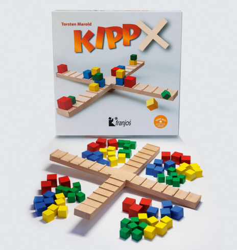 Kipp X est un jeu de 2 à 4 joueurs où le but est simplement d’arriver à être le premier à placer tous ses cubes sur la croix. Attention, si vous faites tomber vos cubes et ceux des autres, vous devez tous les reprendre !