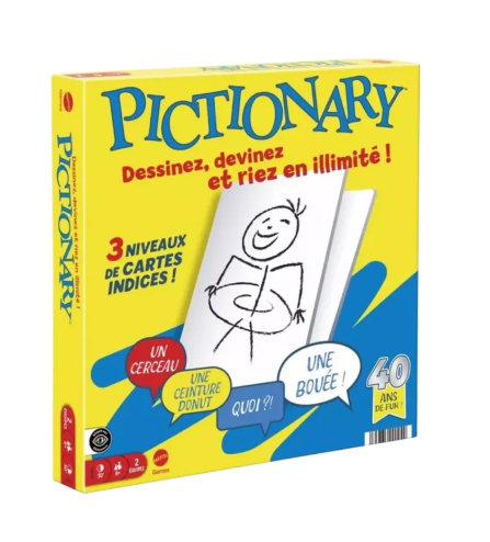 Dessinez, devinez, et gagnez ! Pictionary comprend désormais 2 feutres effaçables, un tableau et de nouvelles cartes mises à jour.