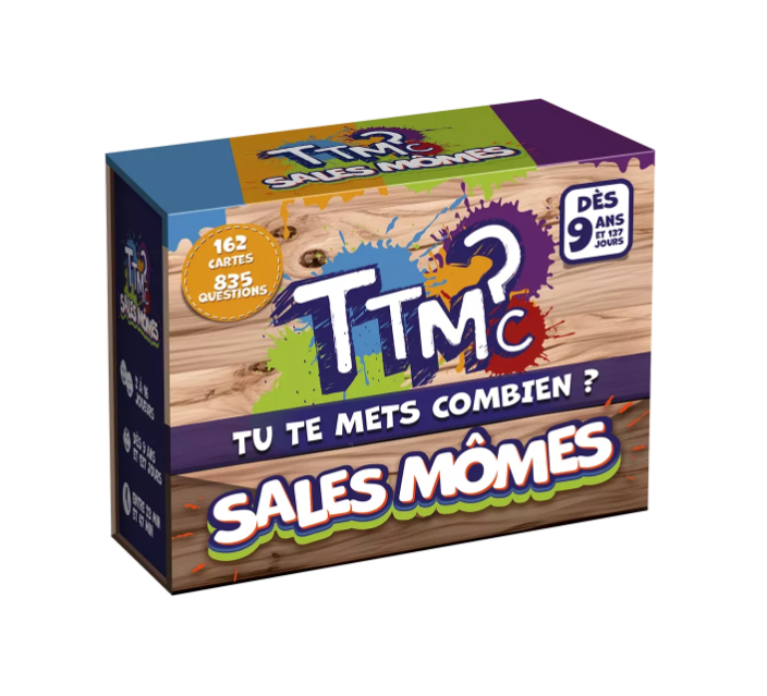 TTMC Sales Mômes, c’est la variante du jeu d’ambiance TTMC – Tu Te Mets Combien ? destinée aux 9-13 ans, dans laquelle ils vont auto-évaluer leurs connaissances de 1 à 5 sur une multitude de sujets adaptés à leur âge. Le but est d’être le premier à parcourir le plateau en répondant aux questions posées. À chaque note correspond une question, plus ou moins complexe : plus la note choisie est élevée, plus la question est pointue. En cas de bonne réponse, l’équipe avancera du nombre de cases correspondant à sa note auto-évaluée. Par exemple si tu réponds juste à une question 3, tu avanceras de 3 cases.